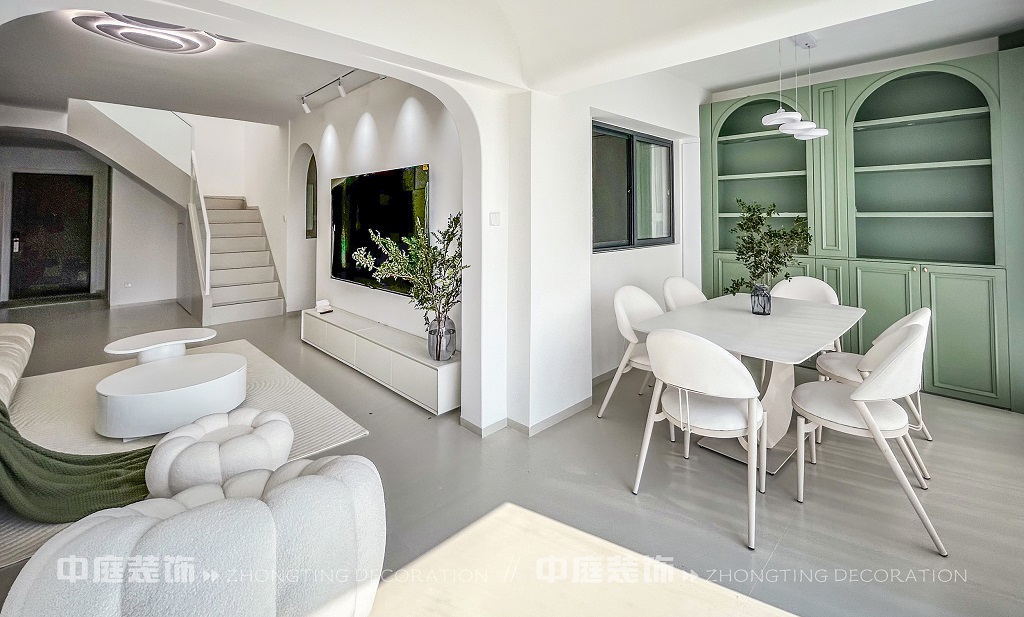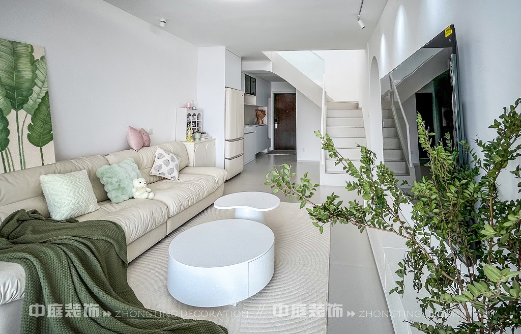 這一套綠意盎然的奶油風(fēng)格好似把森林搬進(jìn)了家,軟乎乎的奶白沙發(fā)搭配苔蘚綠毛毯,抱枕選了粉綠撞色,往上面一躺,一天的疲憊都被融化了!圓潤(rùn)的白色組合茶幾,顏值與實(shí)用并存,氛圍感直接拉滿。墻面掛畫(huà)大葉綠植藝術(shù)畫(huà),角落擺放鮮活綠植,將自然綠意融入空間。